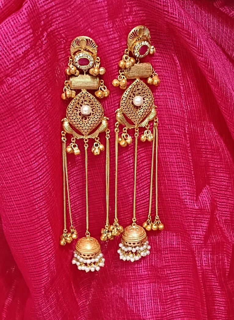 Add a royal touch to your ethnic look with these exquisite Kashmiri-style earrings. Handcrafted with intricate detailing, these earrings feature a traditional motif adorned with golden beads, delicate chains, and a statement jhumka at the end. The elegant pearl drops at the bottom enhance their charm, making them perfect for weddings, festive occasions, or special celebrations.